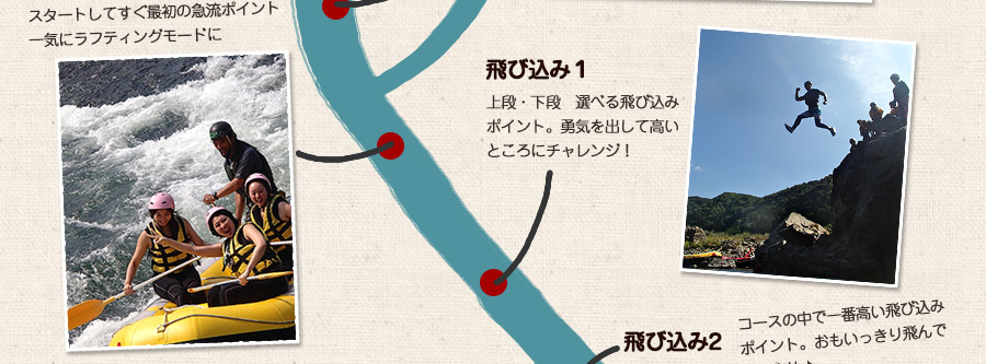 急流の川下り、飛び込みなど!